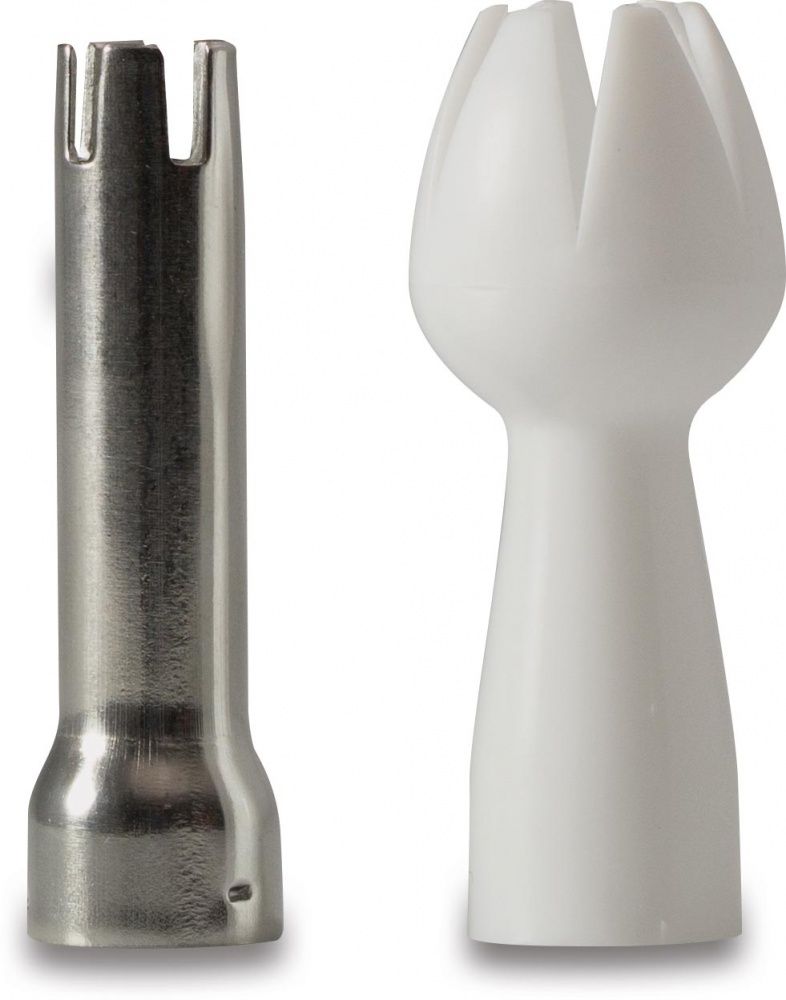 В наборе 2 насадки из нержавеющей стали, 1 насадка из полипропилена и щётка для чистки насадок