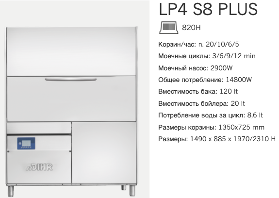 Dihr LP4 S8 Plus DD+DP (Dihr LP4 S8 Plus DDE+PS) - котломоечная машина для ресторанов, столовых и других общепитов. Подходит для мойки котлов, сковород, противней, гастроемкостей и другого кухонного инвентаря. Комплектация: дозатор ополаскивающий; DD (DDE) - дозатор моющий; DP (PS) - сливная помпа. Электронное управление. Двухслойный корпус. 4 цикла: 3/6/9/12 min. Производительность до 20 кассет в час. Кассеты: 1350x725 мм. Максимальная высота посуды: до 820 мм. Напряжение: 380 В, 14,8 кВт. Подключение к горячей воде. В комплекте: 1 корзина из нерж.стали, 1 держатель для подносов из нерж. стали, 1 корзина для лопаток из нерж. стали.