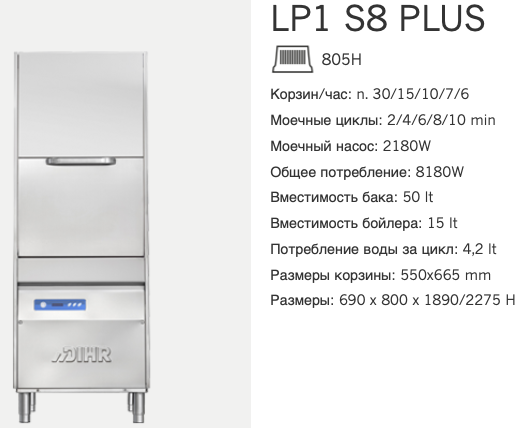 Профессиональная посудомоечная машина Dihr LP1 S8 Plus DD+DP (LP1 S5 Plus DDE+PS) для мытья котлов, сковород, противней, гастроемкостей и другого кухонного инвентаря. Предназначена для использования в ресторанах, столовых, фабриках-кухнях и других предприятий общественного питания и пищевых производствах. Два дозатора, помпа слива.