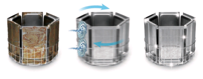 - Двойные легко снимающиеся вертикальные моющие трубки с незасоряющимися соплами с углубленным оттиском, изготовленные для оптимизации взаимодействия потока воды и гранул.