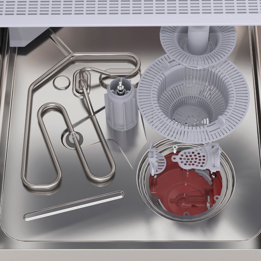 - 4‑ступенчатая система фильтрации, интегрированная в сливную помпу, надёжное улавливание осадка и контроль уровня воды в баке, поддержание чистоты воды в каждом цикле.