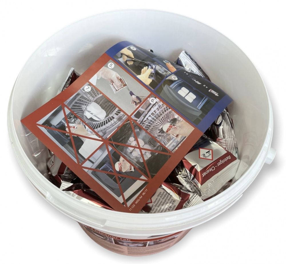 Таблетки 56.00.210 поставляются в ведрах, в индивидуальной фольгированной упаковке красного цвета. Ведра пластиковые, круглые, штабелируемые, с ручкой.