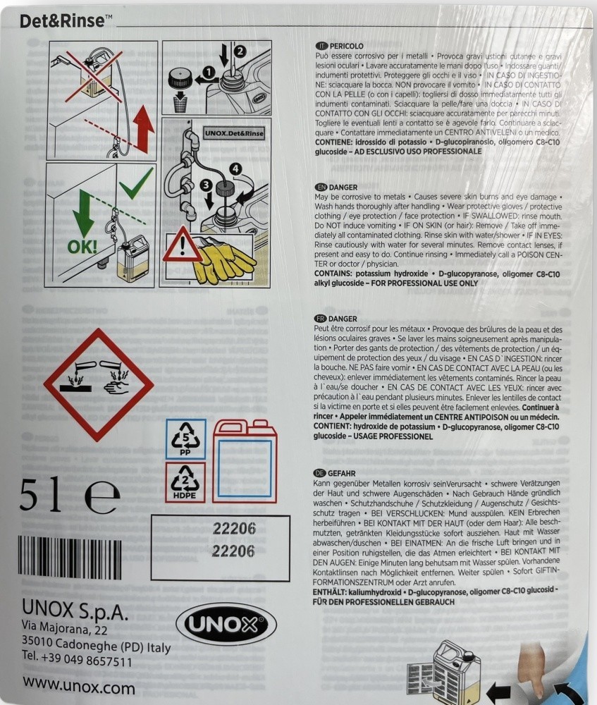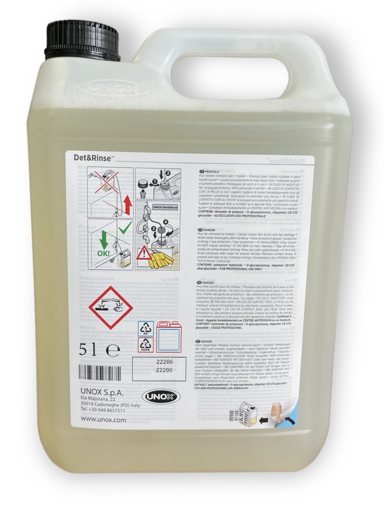 Средство Det&Rinse™ чистящее Unox DB1016A0 (5 литров), 2 в 1 (моющее + ополаскивающее), для профессионального ухода за печами Unox в кафе, ресторанах, столовых, пекарнях и других предприятиях общественного питания.