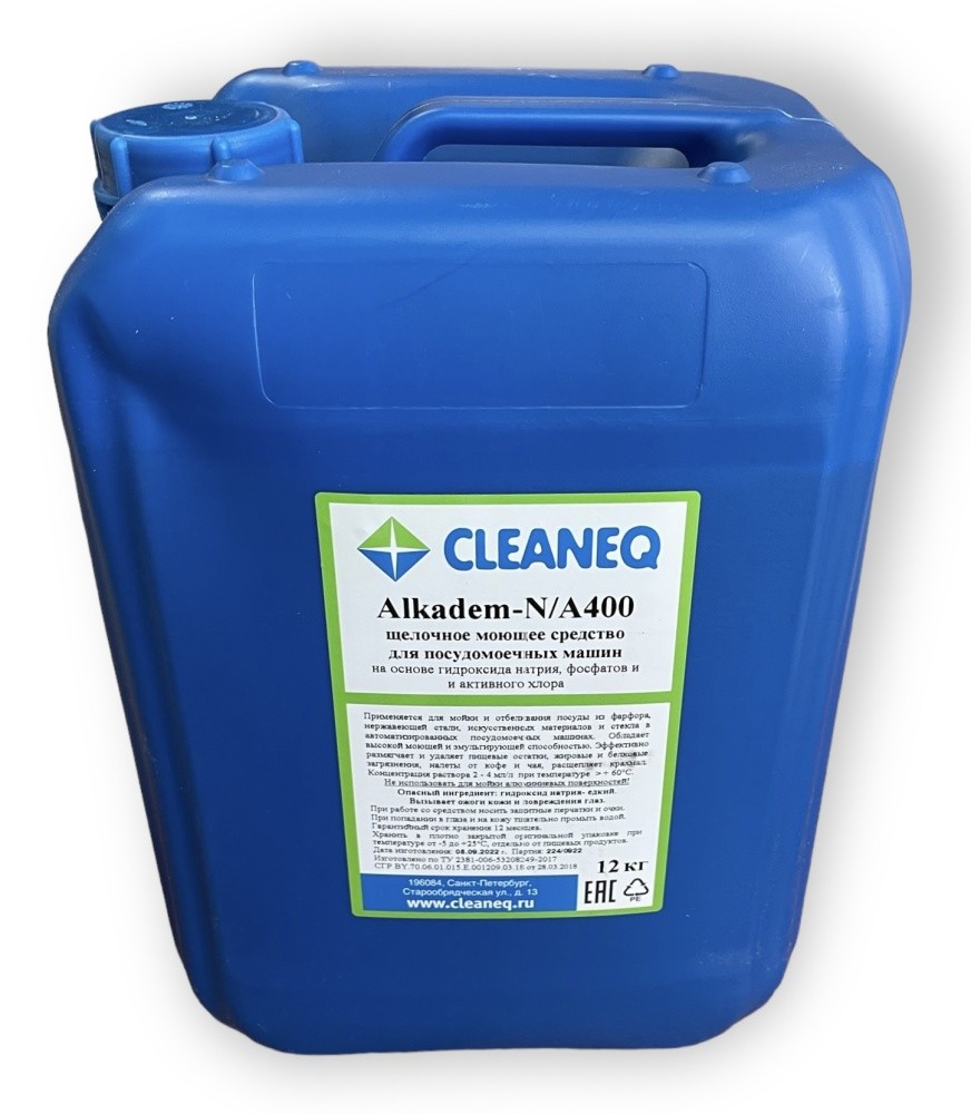 Средство Cleaneq Alkadem® N/A400 — щелочное моющее дезинфицирующее средство с активным хлором для профессионального использования в кафе, ресторанах, столовых и других предприятиях общественного питания и торговли. Применяется в профессиональных посудомоечных машинах всех типов (фронтальные, купольные, туннельные) для мытья мойки посуды, оборотной тары, отбеливания посуды, и промывки трубок систем розлива пива. Объем 10 литров. Не подходит для мойки посуды из алюминия!