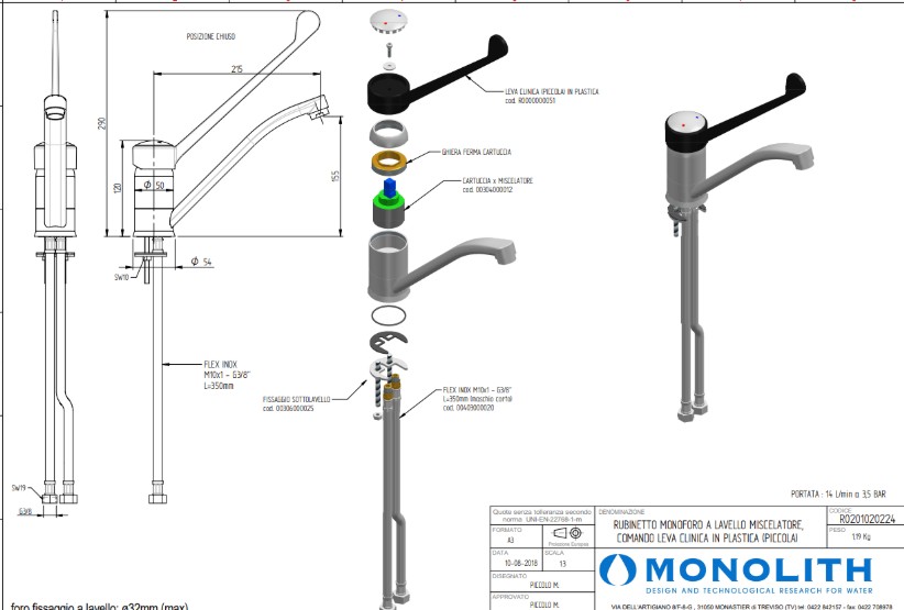 Конструкция смесителя Monolith R0201020224 выполнена в однорычажном исполнении, что гарантирует простоту и интуитивность управления: одной рукой можно одновременно регулировать температуру и напор воды. Монтаж осуществляется на мойку (раковину) через одно отверстие, что упрощает установку и обеспечивает надёжную фиксацию устройства. Поворотный носик с радиусом 215 мм и высотой над уровнем мойки 155 мм позволяет гибко направлять поток воды, минимизируя разбрызгивание и повышая эффективность работы с посудой разных габаритов.Технические характеристики Смесителя Monolith R0201020224