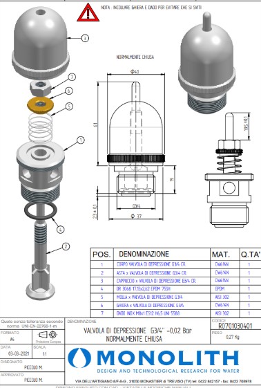 Клапан вакуумный Monolith R0701030401 - специализированное предохранительное устройство итальянского производства, предназначенное для безопасной эксплуатации пищеварочных котлов и систем с пароводяной рубашкой. Изделие предотвращает деформацию оборудования при возникновении разрежения (вакуума) в рабочей полости, обеспечивая стабильность и долговечность инженерных систем на предприятиях общественного питания, пищевых производствах и иных объектах с тепловым оборудованием.
