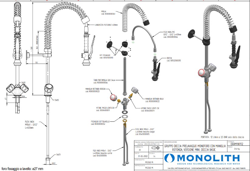 Смеситель с краном и душем Monolith ERAMINI112 - профессиональное сантехническое оборудование итальянского производства, предназначенное для предприятий общественного питания и торговли: ресторанов, кафе, столовых, пекарен и иных объектов HoReCa. Устройство используется для эффективного удаления крупных остатков пищи с кухонной посуды и инвентаря перед загрузкой в посудомоечную машину, а также для мытья фруктов, овощей и других продуктов в моечных раковинах.
