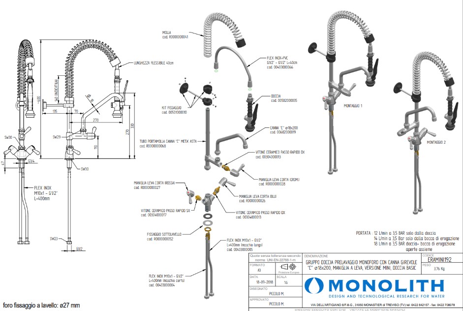 Смеситель с краном и душем Monolith ERAMINI192 - профессиональное сантехническое оборудование итальянского производства, разработанное для предприятий, ресторанов, кафе, пекарен, столовых и иных объектов общественного питания. Устройство предназначено для ежедневной подачи воды требуемой температуры при выполнении технологических операций - от предварительного ополаскивания посуды и инвентаря до мойки продуктов и санитарных процедур.