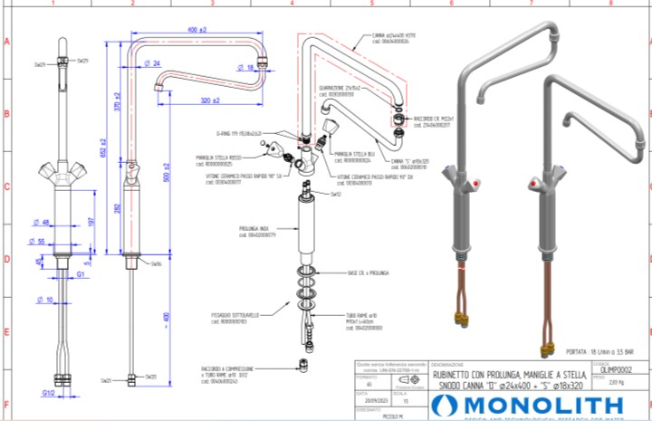 Смеситель Monolith OLIMPO002 - профессиональное сантехническое оборудование итальянского производства, разработанное специально для ресторанов, кафе, столовых, пищевых производств и иных объектов общественного питания. OLIMPO002 – смеситель с увеличенной высотой (вертикальная стойка), поворотным краном и двумя ручками регулировки температуры воды), соединение излива “D” ø24×400 мм + “S” ø18×320 мм. Конструкция смесителя позволяет использовать его на рабочих столах и тепловых линиях для наполнения котлов и кастрюль.