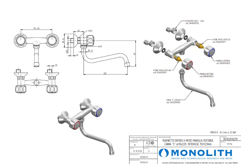 Смеситель Monolith R0102010219 монтируется на стену - это позволяет рационально организовать рабочее пространство профессиональной кухни. Для установки требуются два монтажных отверстия с межосевым расстоянием 150 мм. Ключевые элементы конструкции: двухвентильная система управления с эргономичными ручками типа «Elena» - обеспечивает раздельную и точную регулировку напора и температуры воды, S‑образный поворотный излив длиной 220 мм - гарантирует удобство при наполнении посуды и мойке, обеспечивает достаточный радиус действия, литой корпус из высококачественной латуни - обеспечивает прочность, долговечность и устойчивость к коррозии, хромированное покрытие - защищает от агрессивных моющих средств, облегчает очистку и поддерживает эстетичный внешний вид изделия.Технические характеристики Смесителя с краном Monolith R0102010219