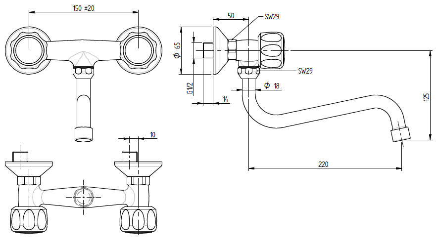 высота излива: 125 мм. Длина излива (гусака): 220 мм. Межосевое расстояние монтажных отверстий: 150 мм. Количество монтажных отверстий: 2 шт.. Материал корпуса: латунь с хромированным покрытием.