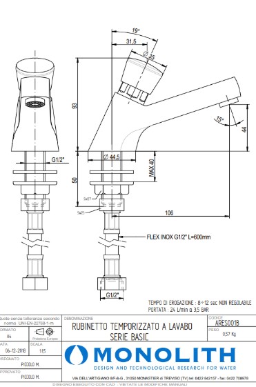 Смеситель Monolith ARES001B - профессиональное сантехническое оборудование итальянского производства, разработанное для предприятий общественного питания и торговли: пекарен, столовых, кафе, ресторанов. Устройство предназначено для ежедневной автоматической подачи холодной воды при выполнении типовых рабочих операций - мытья посуды и кухонного инвентаря, подготовки продуктов. Тип установки: на мойку (одно отверстие). Способ управления: однорычажный. Тип крана: самозакрывающийся (время потока: 8–12 сек). Длина излива: 106 мм. Высота излива: 44 мм. Габариты корпуса (Ш × Г × В): 44,5 × 126 × 143 мм. Вес: 0,57 кг