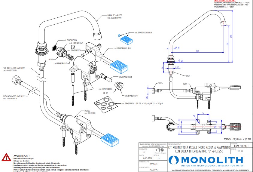 Смеситель педальный горизонтальный Monolith ERMES001KIT - профессиональное сантехническое оборудование итальянского производства, разработанное для предприятий общественного питания и торговли: ресторанов, кафе, столовых, пекарен, пищевых производств. Устройство обеспечивает гигиеничную подачу воды без контакта рук с краном - управление осуществляется посредством ножного привода, что критически важно в зонах с повышенными санитарными требованиями (моечные участки, санитарные узлы, зоны подготовки продуктов).