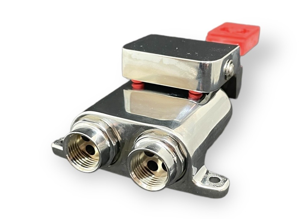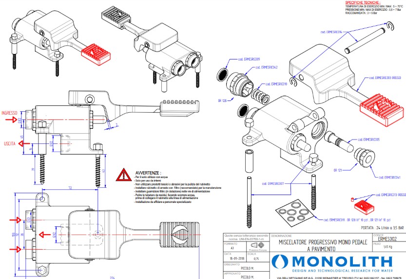 Ключевая особенность модели Monolith ERMES002 - педальное управление: для поступления воды необходимо нажать и удерживать педаль; при отпускании поток мгновенно прекращается. Температура подаваемой воды регулируется непосредственно в смесителе за счёт смешивания потоков горячей и холодной воды. Такое решение обеспечивает: максимальную гигиеничность - полностью исключается контакт рук с поверхностями смесителя, что минимизирует риск переноса бактерий и соответствует строгим санитарным нормам, экономию воды - подача осуществляется только в момент нажатия на педаль, что позволяет снизить расход на 20–30 % по сравнению с традиционными смесителями, удобство эксплуатации - персонал может свободно манипулировать посудой или продуктами, не отвлекаясь на управление краном, энергонезависимость - работа смесителя не требует электричества или батареек, гарантируя бесперебойную подачу воды в любых условиях.