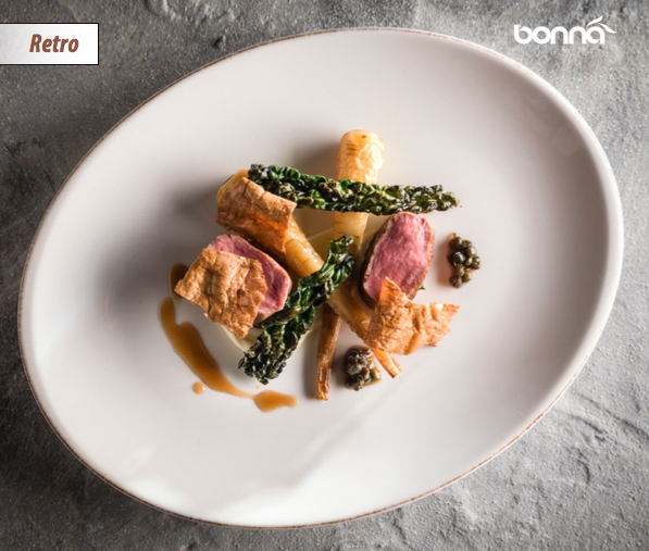 Коллекция фарфора Bonna выполнена из профессионального твердого фарфора теплого сливочного оттенка. По краям изделий вручную нанесен декор в виде кофейной крошки. Нанесение декора делается под глазурь, вследствие чего, все изделия можно мыть в посудомоечной машине. Фарфор Bonna отличается своей прочностью, устойчивостью к сколам и механическим воздействиям, что делает его идеальным для профессионального использования.