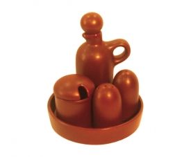 Оригинальный набор для специй на тарелочке-подставке с высоким бортиком состоит из перечницы, солонки, баночки для горчицы и уксусника.