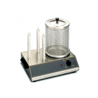 Хот-дог аппарат включает в себя пароварку для приготовления сосисок и подогреватель для булочек. При помощи этой машины сосиски обрабатываются паром в цилиндре из борсиликатного стекла, закрепленном над резервуаром с водой. 3 штыря для булочек. Приготовление сосисок занимает около 1-й минуты. Разогрев булочек на штырях занимает около 30 сек. Материал емкости пароварки: Pyrex. Корзина пароварки состоит из 2-х отсеков и вмещает до 40 сосисок. Корпус из нержавеющей стали. 3 нагревательных элемента; система регулирования мощности; корзина с двумя отсеками; электромеханическая система управления; передняя панель оснащена сигнальными лампами; настольное исполнение.