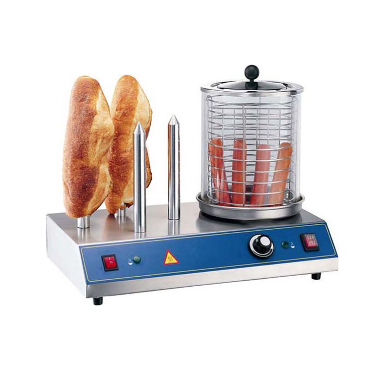 Аппарат для хот-догов JEJU JG07 включает в себя пароварку для приготовления сосисок и подогреватель для булочек. Приготовление сосисок занимает около одной минуты. Разогрев булочек на штырях – 30 секунд. Материал емкости пароварки – Pyrex. Корпус из нержавеющей стали. Количество штырей – 4 шт.