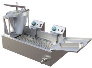 Пончиковый аппарат с краном, объем дозатора - 6 л, объем фритюра- 10 л, производительность - 300 понч/час, вес - 15 кг. Аппарат пончиковый состоит из четырёх основных узлов: Фритюрная ванна, ручной дозатор (над фритюрной ванной на специальном кронштейне, имеет уникальную головку для формирования пончиков, которая позволяет работать на тесте практически любой консистенции от жидкого до достаточно густого), блок управления с электронагревателем (осуществляет нагрев и поддержание заданной температуры во фритюрной ванне), поддон (для выкладки из ванны готовых пончиков).