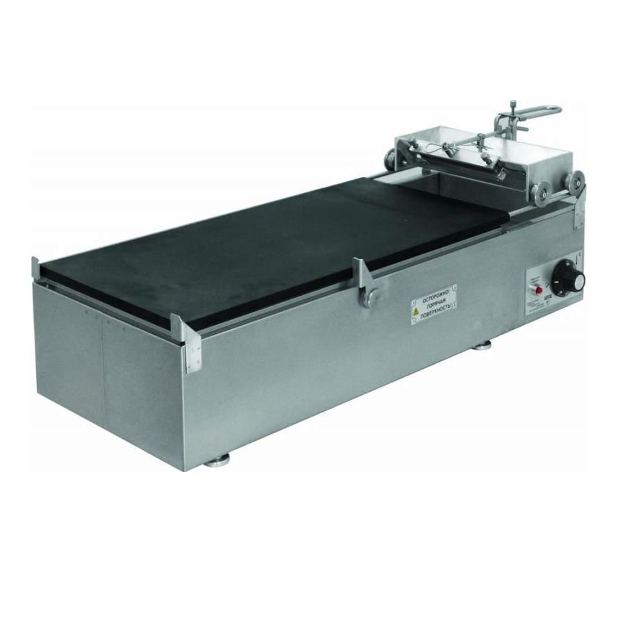 Блинница электрическая имеет одну рабочую прямоугольную поверхность и каретку-дозатор, предназначена для жарки блинов прямоугольной формы. Вместимость - 1 блин размером 220х470 мм или 2 блина размером 220х220 мм каждый. Время разогрева не более 20 мин до +230С. Толщина блинной заготовки - 1 - 4 мм получается при вытекании теста через отверстия дозирующего устройства и его автоматическом разглаживании в процессе перемещения каретки над разогретой жарочной поверхностью.
