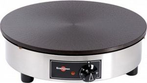 Блинница Krampouz CEBIV3 - электрическая настольная, 1 конфорка из чугуна диаметром 35 см. Круглый корпус из нержавеющий стали AISI304, прост в очистке. В качестве нагревательного элемента в блинном аппарате используется спиральный ТЭН (спираль с керамическими элементами, вставленными в пазы рабочей поверхности), обеспечивающий равномерное распределение тепла по всей поверхности. Рабочая температура от + 50 до + 300 ºС . Толщина жарочной поверхности 1 см. Есть защитный термостат. Вес 12 кг. Ножки высотой 3 см. Блинница оснащена аналоговым термостатом, сигнальным индикатором. Без кнопки вкл/выкл.