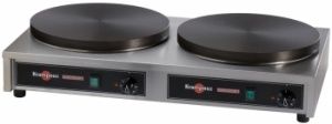 Блинница Krampouz CECIG4AQ - электрическая настольная, 2 чугунные конфорки диаметром 40 см. Прямоугольный корпус из нержавеющий стали AISI304, прост в очистке. Мощность одной конфорки 3,6 кВт. Рабочая температура от + 50 до + 300 ºС. Толщина жарочной поверхности 2 см. Защитный термостат. Ножки высотой 3 см. Блинница оснащена аналоговым термостатом, сигнальным индикатором, кнопкой вкл/выкл.