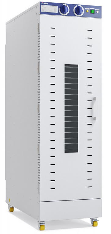 Шкаф сушильный (дегидратор) Abat ШС-32-1-01 профессиональный для высушивания овощей, фруктов, ягод, грибов, трав, зелени, орехов, мяса, рыбы, пастилы и других продуктов на фабриках кухнях и пищевых производствах. Напольный, загрузка 32 уровня GN 1/1-20 (530х325 мм) или EN 1/1 (600х400 мм). Корпус из окрашенного металла. Одна камера, одна распашная дверь. Мощность: 3,13 кВт / 220 В. Температура: +30...+85°C. Габариты: 435х870х1426 мм. Масса: 60 кг.