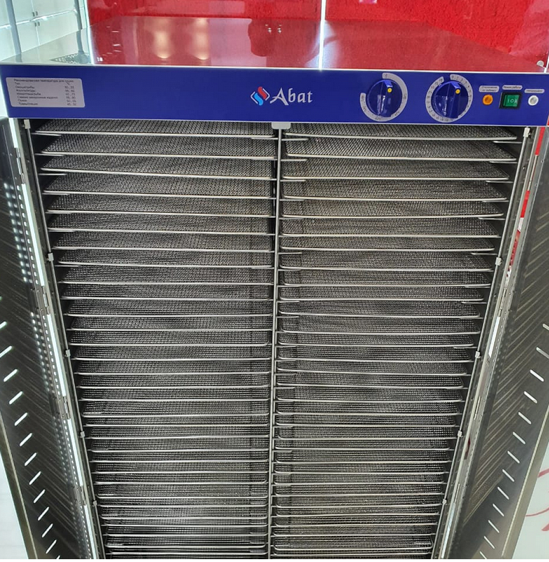 Шкаф сушильный (дегидратор) Abat ШС-32-2Г-03 профессиональный для высушивания овощей, фруктов, ягод, грибов, трав, зелени, орехов, мяса, рыбы, пастилы и других продуктов на фабриках кухнях и пищевых производствах. Напольный. Двухкамерный с распашными дверцами. 64 (2х32) уровня GN 1/1 или 600х400. Корпус из нержавеющей стали.