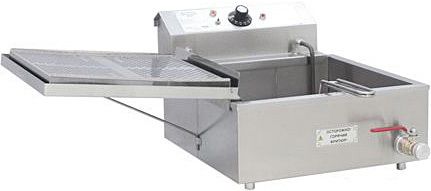 Ванна фритюрная электрическая с решеткой для чебуреков и пончиков. Размер рабочей (внутренней) ванны - 330х330х120 мм. Вес - 6,5 кг. Фритюрница изготовлена из шлифованной нержавеющей стали. Крышка фритюрницы является одновременно рабочей дренажной полкой, на которую ставится сетка с обжаренным продуктом для стекания масла обратно в емкость фритюрницы.