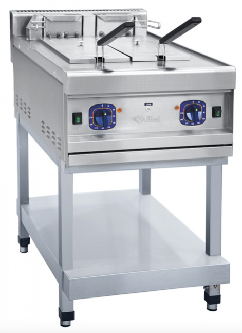 Промышленная электрическая фритюрница ЭФК-90/2П, является элементом модульной электрической тепловой линии Abat 900. Может быть установлена и эксплуатироваться самостоятельно или в составе технологической линии. Оснащена двумя ваннами с раздельной регулировкой, двумя корзинами для продуктов, двумя терморегуляторами на фронтальной панели. Ванна сложной пятиугольной формы со скосом внизу и холодной зоной. Холодная зона препятствует подгоранию опускающихся на дно крошек и остатков продукта, продлевая срок службы масла. Поставляется с подставкой. Слив масла осуществляется из крана расположенного под ванной в гастроёмкость, вставляемую в специальные направляющие в подставке.
