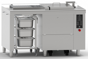 - Тележка на 3 гастроемкости GN 1/1 с поворотными колесами для установки под воронкой для выгрузки продукта.