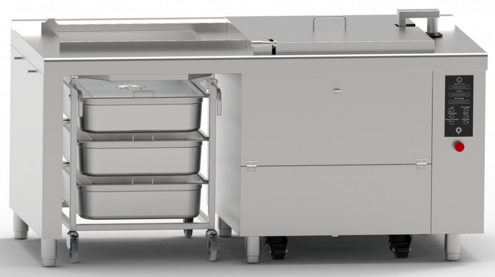 - Тележка на 3 гастроемкости GN 2/1 с поворотными колесами для установки под воронкой для выгрузки продукта.