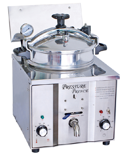 Фритюрница электрическая Kocateq PFE 16 под давлением, настольная, 1 ванна, объем 10 л, из нержавеющей стали. Герметичная крышка фиксируется с помощью болта. Температурный режим 50-200 ºС. Максимальная загрузка продукта 3-3,5 кг. Фритюрница с корзиной со специальным крючком для подвешивания. Ёмкость из алюминия, риски, для определения максимального количества масла. Световой индикатор работы фритюрницы и индикатор нагрева. Аналоговая панель управления. Кран для слива масла. Установлена блокировка слива масла, таймер, манометр. Фритюрница устанавливается на пластиковых ножках высотой 2,5 см.