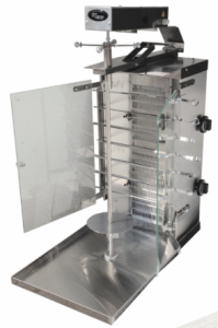Grill master Ф2ШмГ (г.г., с мотором,стек. экр.) с загрузкой до 40 кг мяса (с автоматическим вращением до 20кг), защитные экраны из закаленного стекла, снабжен системой газконтроля и газовым краном, позволяющим производить плавную регулировку уровня нагрева беспламенной горелки.