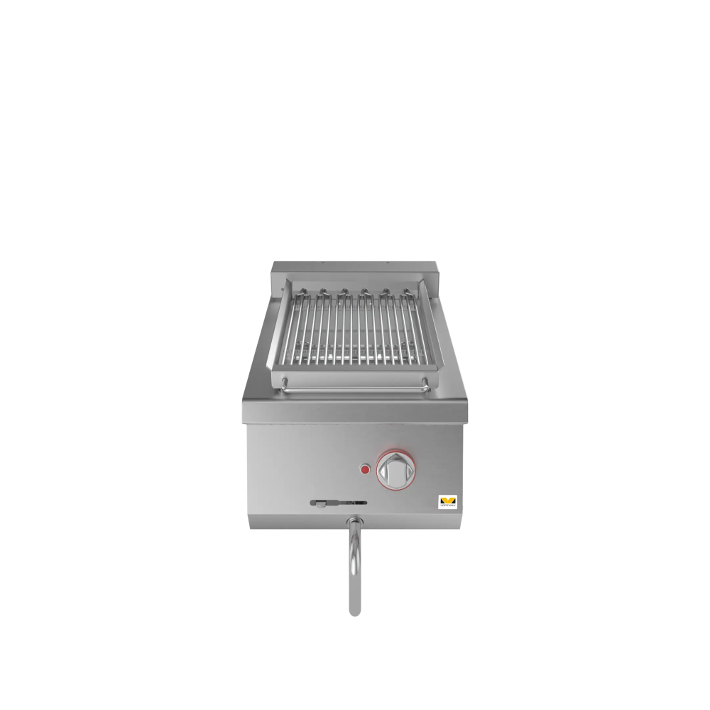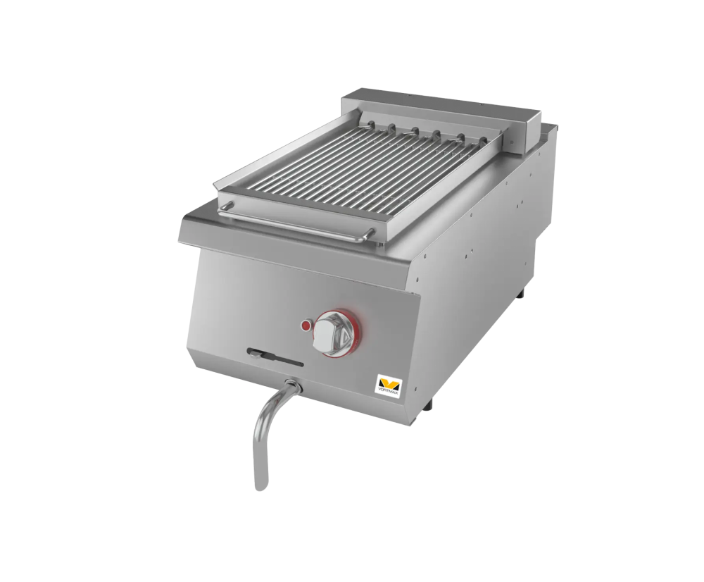 Модель оснащена термостатом и трехрежимным регулятором нагрева, что позволяет точно контролировать температуру в процессе готовки. Спереди расположен водяной резервуар с удобным сливным краном. Благодаря компактным размерам и продуманной конструкции, гриль легко разместить даже в условиях ограниченного пространства.