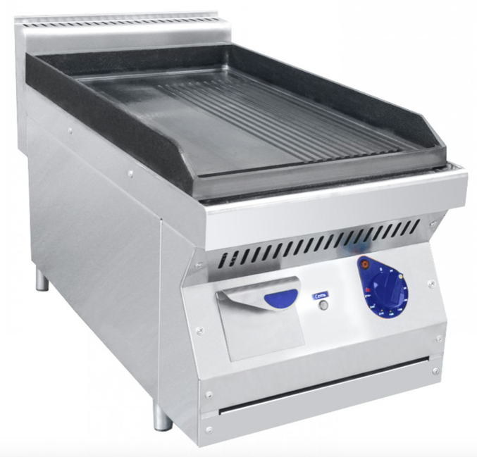 Промышленная жарочная поверхность АКО-40/1Н-Ч-00 с одной рабочей зоной поделенной на гладкую и рифленую поверхности. Элемент модульной электрической тепловой линии Abat 700. Жарочная поверхность из чугуна с П-образным бортиком предотвращающим разбрызгивание жира и жиросборником. Электромеханическое управление, жиросборник расположены на фронтальной панели. Может устанавливаться отдельно или в составе тепловой линии. Аппарат может быть установлен на стол или подставку МН-02.