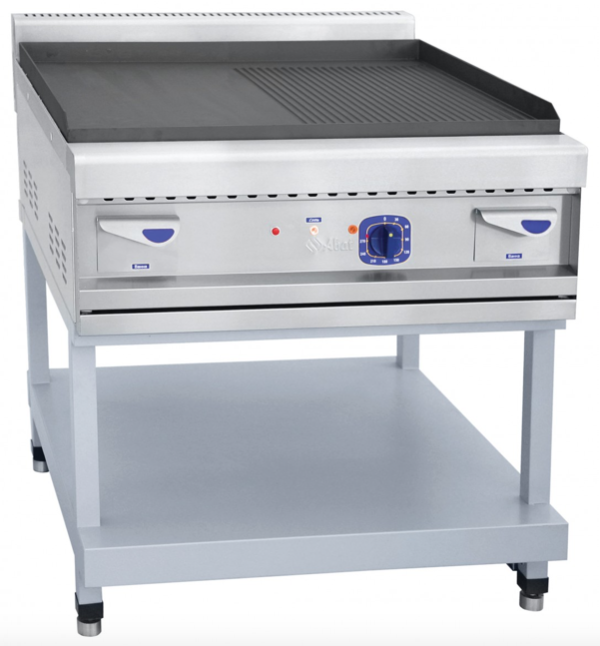 Промышленная жарочная поверхность АКО-90/1КП-С-00 с одной сплошной комбинированной поверхностью с одной зоной готовки. Элемент модульной электрической тепловой линии Abat 900. Жарочная поверхность из стали с П-образным бортиком предотвращающим разбрызгивание жира и жиросборником. Электромеханическое управление, жиросборник расположены на фронтальной панели. Может устанавливаться отдельно или в составе тепловой линии. Поставляется с подставкой из крашенной стали.