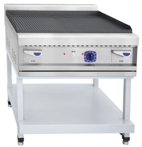 Промышленная жарочная поверхность АКО-90/1КП-С-02 с одной сплошной рифленой поверхностью с одной зоной готовки. Элемент модульной электрической тепловой линии Abat 900. Жарочная поверхность из стали с П-образным бортиком предотвращающим разбрызгивание жира и жиросборником. Электромеханическое управление, жиросборник расположены на фронтальной панели. Может устанавливаться отдельно или в составе тепловой линии. Поставляется с подставкой из окрашенной стали.
