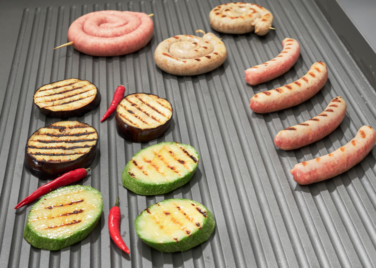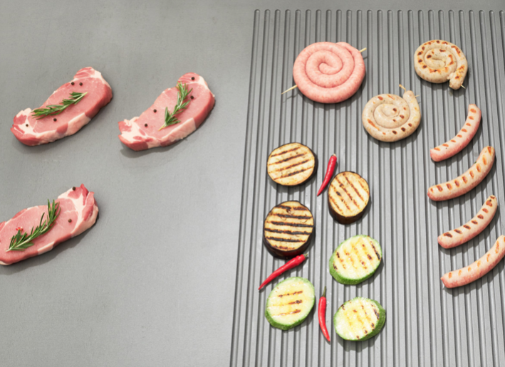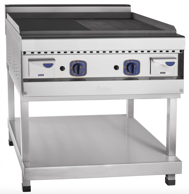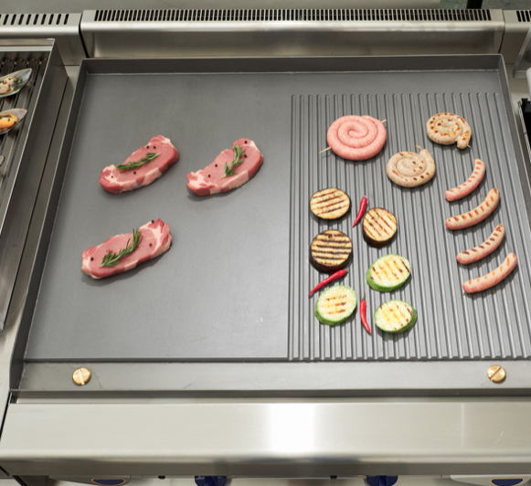 - Комбинированная стальная жарочная поверхность, 1/2 гладкая - 1/2 рифленая.
