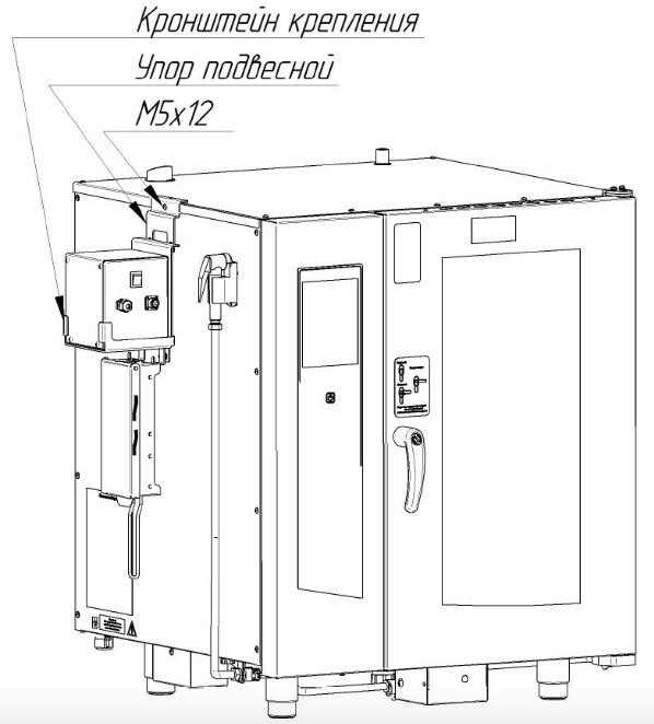 - Крепление дымогенератора к пароконвектомату через кронштейн крепления и подвесной упор.
