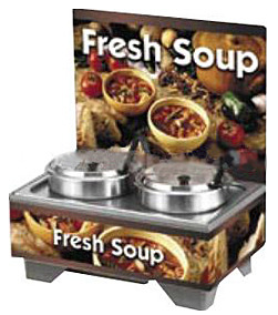 Мармит электрический настольный для супа, влажного типа, имеет в комплекте базу код 1220, заднюю рекламную панель код 03, адаптер код 19192 для ёмкостей, из нержавеющей стали, 2 цилиндрические ёмкости код 78184 объёмом 6,6л, 2 откидывающиеся крышки код 47488, 2 половника код 4980320 объёмом 0,084л, вилку Schuko для подключения к сети. ТЭНы находятся в непосредственном контакте с водой. Световой индикатор загорается при низком уровне воды в ванне. Рекламная вывеска снимается для очистки и может быть перевёрнута на другую сторону.
