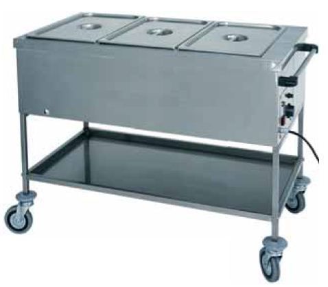 Мармит передвижной Forcar CT1760 парового типа на 3 GN1/1-200 с нижней полкой, 1 боковой ручкой изготовлен из нержавеющей стали. Температурный режим - от +30С до +90С. Нижняя полка оснащена бортиком по периметру. Каждое колесо имеет резиновый кольцевой буфер.