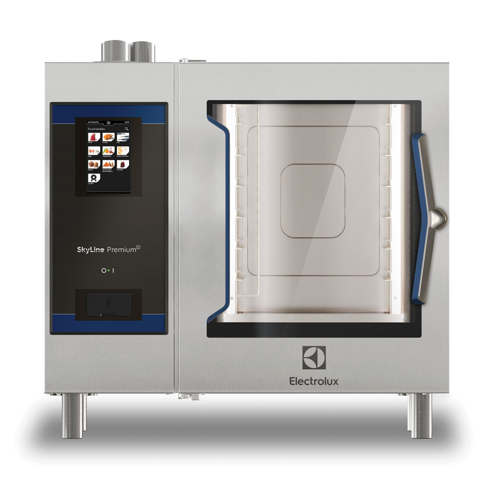 Пароконвектомат электрический бойлерный Electrolux 229726 (ECOE61T3AL) серии SkyLine Premium S Эко с сенсорным управлением, 6x1/1 GN, 3 режима приготовления (автоматический, рецептурная программа, ручной), автоматическая очистка, 3-х слойное остекление двери, петли двери слева, трехфазный.