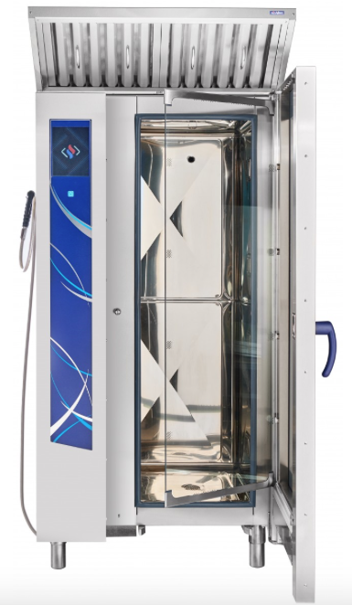 - Двухходовый механизм открывания двери обеспечивает безопасность персонала от ожогов горячим паром.