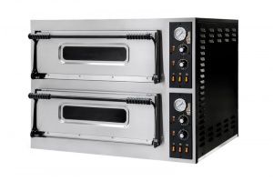 Стандартная панель управления — механическая, поверхность для выпечки изготовлена из огнеупорного материала (шамот). Габариты камеры внутренние: 660х660х140 мм. Максимальная температура - +500С. 2 камеры вместимостью до 4 пицц (в одной камере) диаметром 30 см.