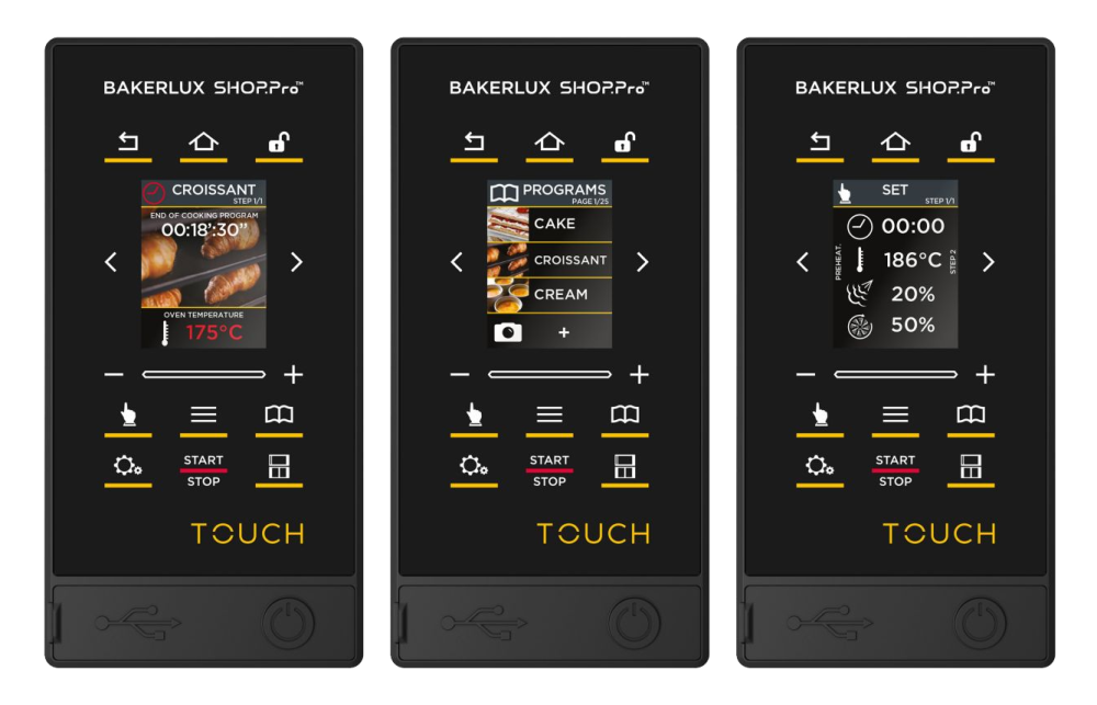 Цифровая панель управления BAKERLUX SHOP.Pro™ TOUCH с экраном 2,4 дюйма предлагает широкие возможности настроек, удобное использование и возможность сохранения программ приготовления.