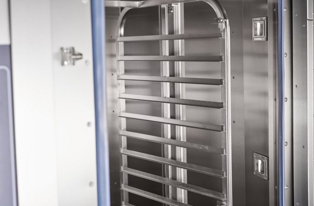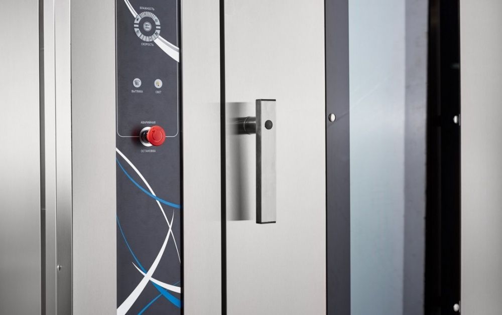 - Совершенная аэродинамика обеспечивает равномерную температуру по всей рабочей камере и совместно с вращением тележки позволяет достичь равномерной окраски выпечки на всех уровнях тележки-шпильки