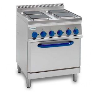 Плита электрическая 700 серии оснащена 4 квадратными конфорками (220х220 мм) и духовым шкафом (4хGN2/1). Изготовлена из нержавеющей стали AISI 304. 7-позиционные переключатели мощности: 4 шт. Мощность конфорки: 2,6 кВт, защитный термостат. Мощность жарочного шкафа: 4,7 кВт. Температура жарочного шкафа: 60-300 °C. В комплекте решетка для жарочного шкафа - 1 шт.