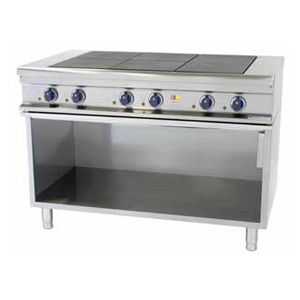 ES-T67/P 55833, Kovinastroj (Kogast) - электрическая шестиконфорочная промышленная плита, 700 серии, на открытой подставке для кафе, школ, столовых, ресторанов, заведений фаст-фуд, кулинарий и других предприятий общепита и пищевых производств. 6 квадратных конфорок 300х300 мм из чугуна. Сплошная рабочая поверхность. Напольная установка. Корпус из н.стали AISI 304. Напряжение: 380 В; 15 кВт.