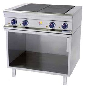 ES-T47/P 55824, Kovinastroj (Kogast) - электрическая плита для кафе, школ, столовых, ресторанов, заведений фаст-фуд, кулинарий и других предприятий общепита и пищевых производств. 4 квадратные конфорки 300х300 мм из чугуна. Сплошная ровная поверхность. Напольная установка. Открытая подставка-шкаф. Корпус из н.стали AISI 304. Напряжение: 380, 10 кВт. Элемент модульной тепловой линии 700 серии.